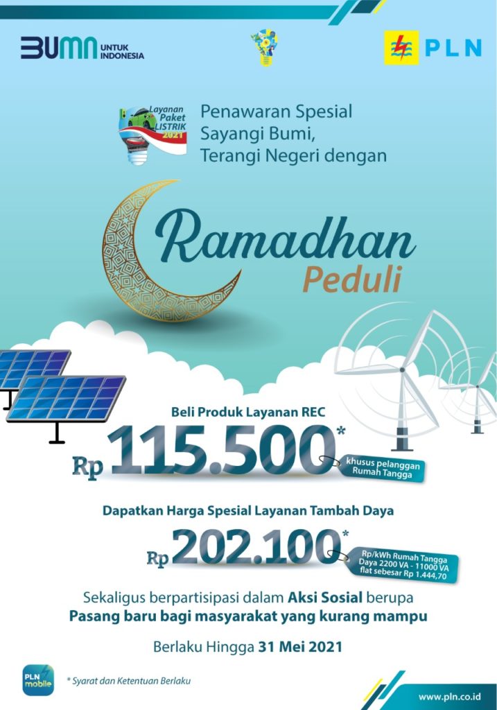 Melalui Ramadan Peduli, pelanggan rumah tangga daya 450 VA sampai dengan 7.700 VA dapat membeli produk Renewable Energy Certificate (REC) sebesar Rp 115.500,- yang ditujukan untuk mendukung pembangunan energi terbarukan sekaligus ikut serta dalam aksi sosial berupa pasang baru bagi masyarakat kurang mampu. Sebagai bonus tambahan, pelanggan akan mendapatkan harga spesial layanan tambah daya hingga 11.000 VA hanya dengan biaya sebesar Rp 202.100,-.