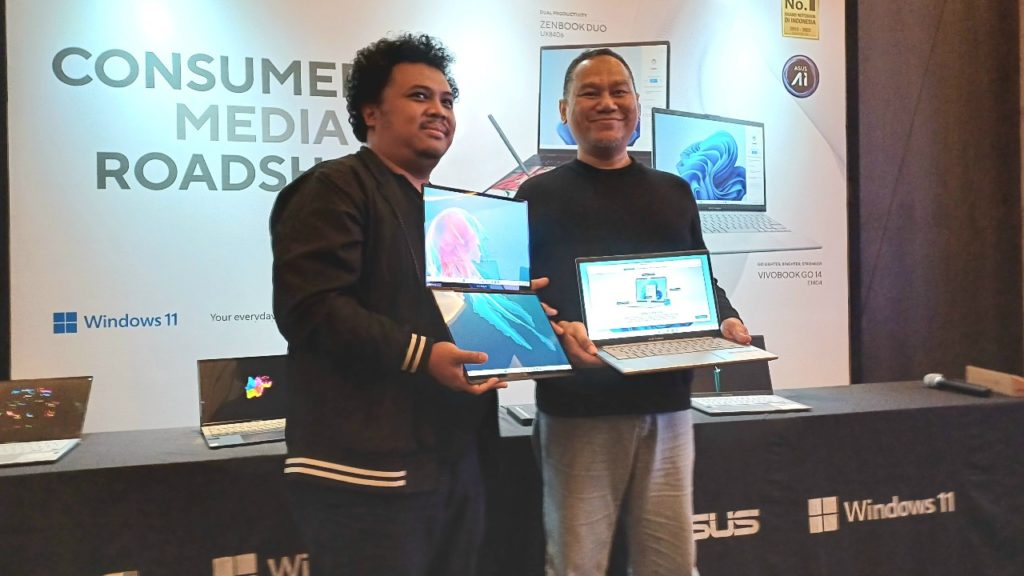 Head of Public Relation ASUS Indonesia Muhammad Firman bersama Product Marketing PC Consumer Laptop, ASUS Indonesia Luthfi Fuardi, memamerka Lopto Terbaru Asus AI di acara Consummer PC Media Roadshow di Semarang (6/6/2024). (ist)