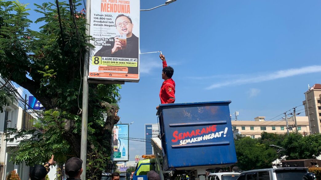Semarang, UP Radio – Hari kedua masa tenang, Badan Pengawas Pemilu (Bawaslu) Kota Semarang melakukan pembersihan alat peraga kampanye (APK) yang masih bertebaran.