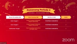 Penghargaan GI BEI tahun ini menjadi tahun kesebelas penyelenggaraan acara ini. Kategori penghargaan pertama adalah Kategori GI BEI Teraktif berdasarkan Penambahan Jumlah Rekening Efek di periode penilaian Oktober 2020 – September 2021, dimenangkan oleh Universitas Muhammadiyah Purwokerto dengan jumlah pertumbuhan rekening efek baru sebanyak 2.330 SID. Disusul oleh UIN Raden Mas Said Surakarta di posisi kedua dengan 1.115 SID, dan Universitas Islam Malang di posisi ketiga dengan 877 SID baru.