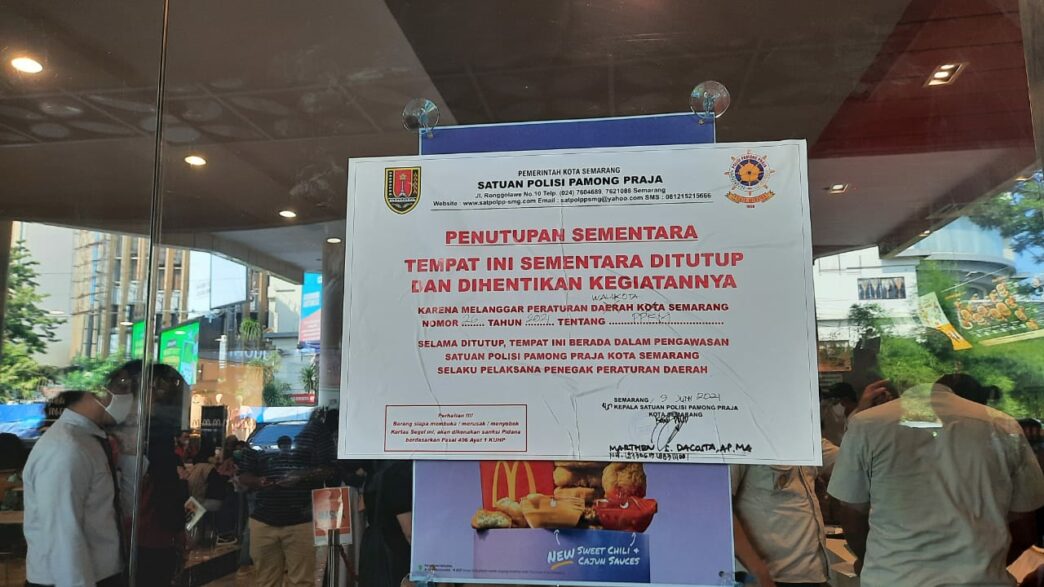 Untuk mewaspadai penyebaran virus corona (Covid-19) yang saat ini tengah mewabah, Satuan Polisi Pamong Praja (Satpol PP) Kota Semarang pun akhirnya menutup restoran cepat saji McDonald’s di Kota Semarang, Rabu (9/6/2021).