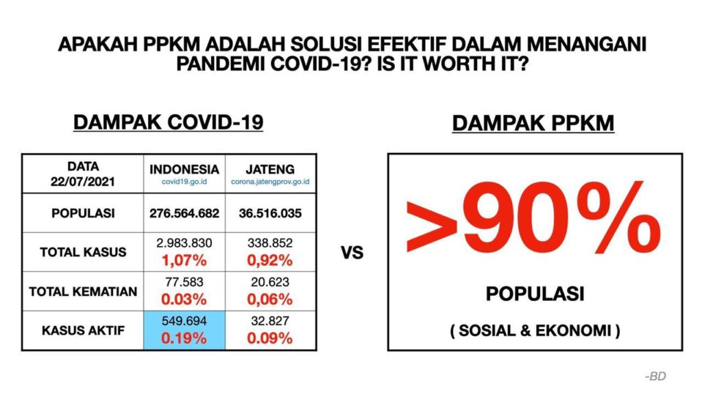 “Apakah bener solusi yang diberikan untuk mengatasi masalah terhadap 1 % penduduk harus mengorbankan ekonomi dunia usaha yang berdampak terhadap 90% populasi. Kok secara angka tidak sesuai sekali. Ini sudah 17 bulan tapi masih begini-begini saja,” imbuhnya.