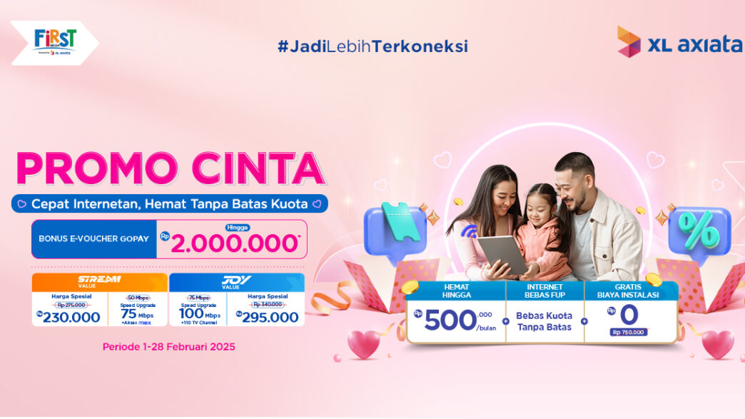 Jakarta, UP Radio – Merayakan bulan penuh kasih sayang di bulan Februari, PT XL Axiata Tbk (XL Axiata) melalui First Media menghadirkan promo spesial untuk pelanggan baru maupun pelanggan setia. Nama promonya “CINTA’’ (Cepat Internetan, Hemat Tanpa Batas Kuota) dan “ROMANTIS’’ (Rangkaian Promo Mantab Abis).