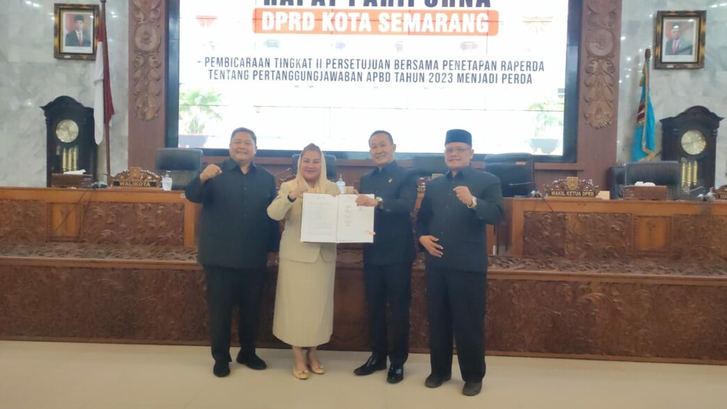 Semarang, UP Radio – Dewan Perwakilan Rakyat Daerah (DPRD) Kota Semarang menetapkan Rancangan Peraturan Daerah (Raperda) terkait Pertanggungjawaban APBD tahun 2023 menjadi Peraturan Daerah (Perda) dalam Rapat Paripurna di Gedung DPRD Kota Semarang, Kamis (4/7/2024).