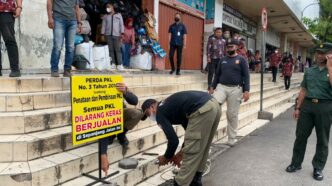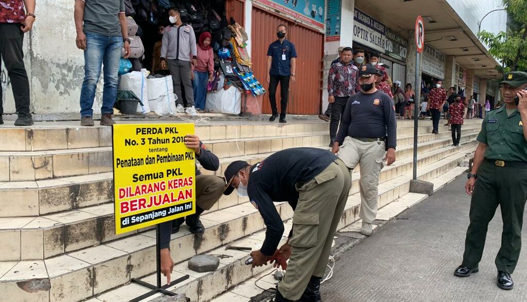 Melihat hal tersebut, Kamis (30/3/2023) petugas Gabungan Satpol PP Kota Semarang dan Dinas Perdagangan Kota Semarang memasang tiang pemberitahuan larangan berjualan.