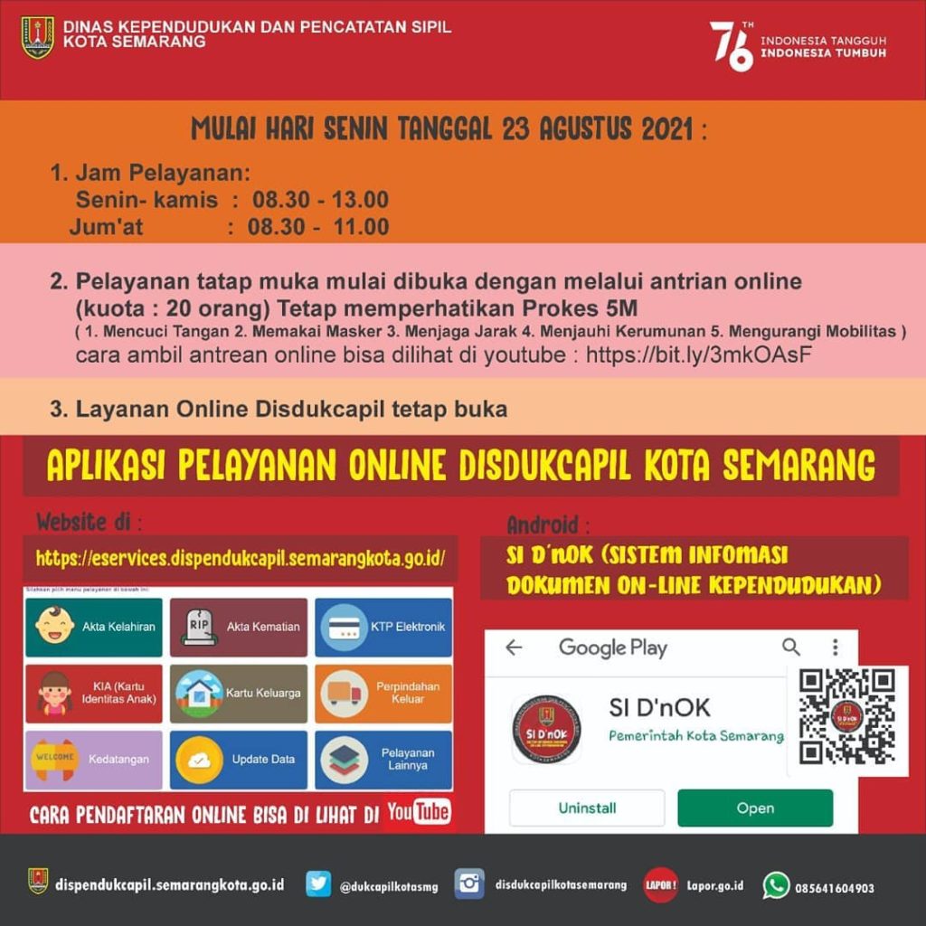 Masyarakat diminta untuk mengisi antrean online yang dibatasi kuota 20 orang. Antrean online bisa diakses di https://eservices.dispendukcapil.semarangkota.go.id/. Selain itu bisa melalui aplikasi Si Dnok di Playstore. (ksm)