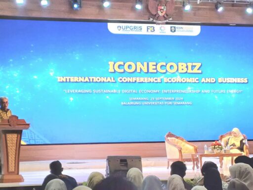 Semarang, UP Radio – Fakultas Ekonomi dan Bisnis Universitas PGRI Semarang (FEB UPGRIS) mengelar International Conference Economic and Bisnis (ICONECOBIZ) yang membahas tentang perkembangan situasi ekonomi nasional maupun global dengan tema “Leveraging Sustainable Digital Economy, Enterpreanuership and Future Energy”, di Balairung UPGRIS, Rabu (25/9/2024).