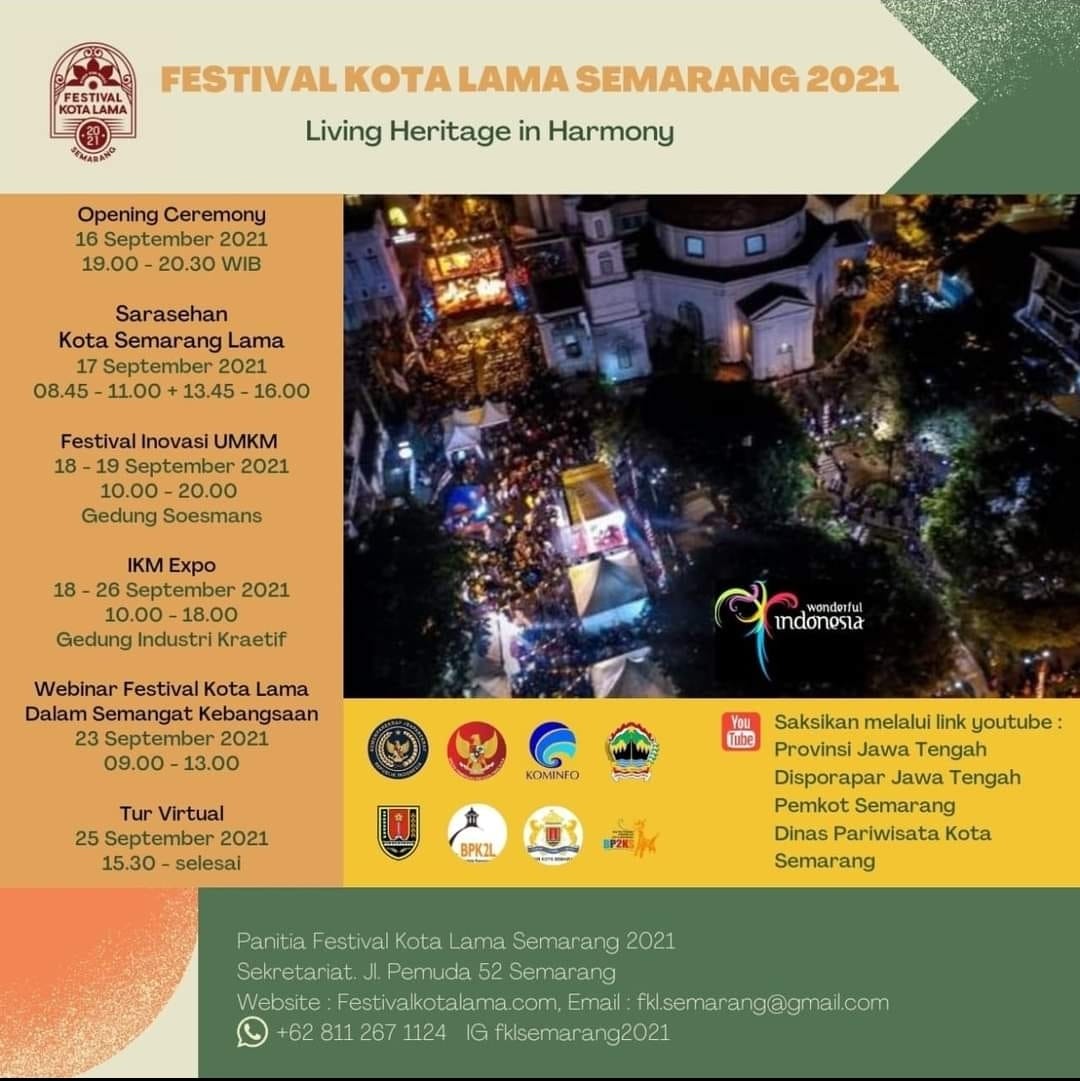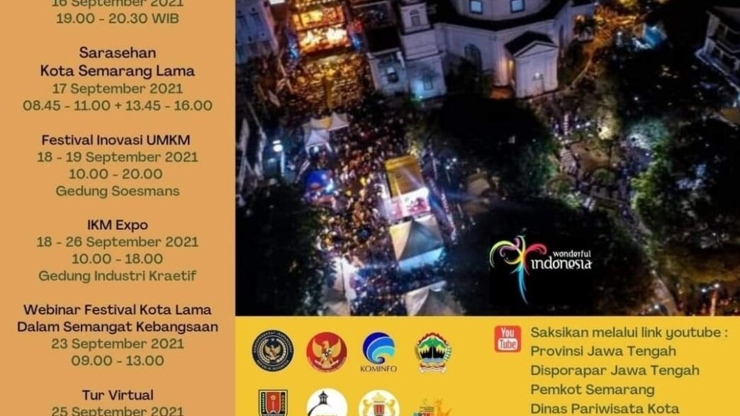 Semarang, UP Radio – Festival Kota Lama Semarang mulai digelar kembali pada tanggal 16 hingga 24 September 2021 yang akan dilakukan secara virtual. Kegiatan yang akan mengembangkan pariwisata Kota Lama ini didukung penuh oleh Pemerintah. Festival ini diharapkan akan lebih menghidupkan Kota lama Semarang yang merupakan kawasan cagar budaya.