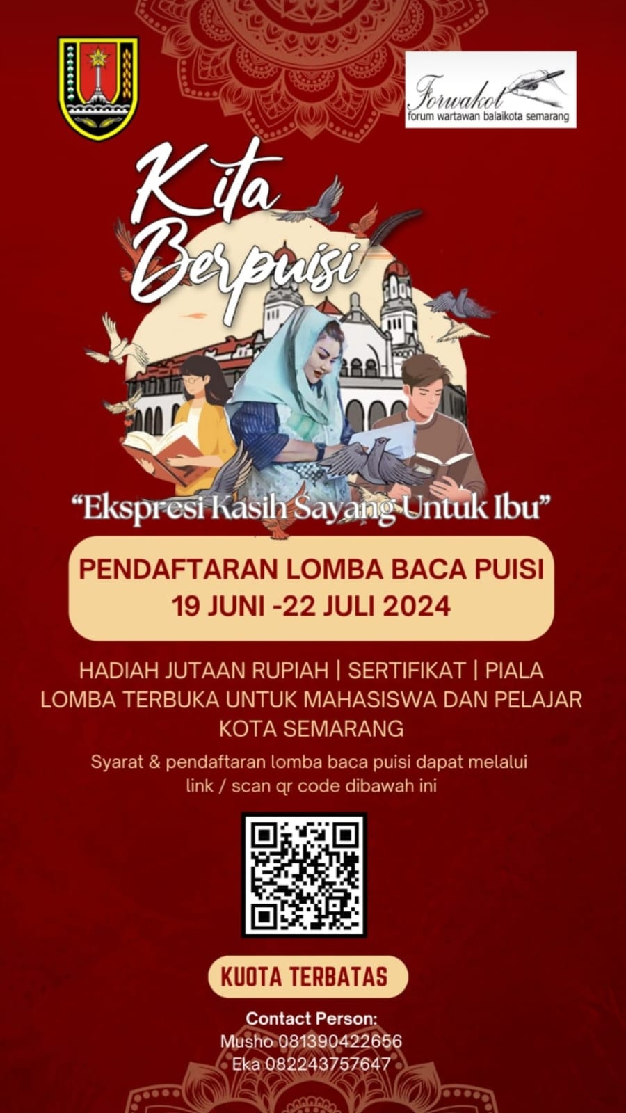 Semarang, UP Radio – Forum Wartawan Balai Kota (Forwakot) Semarang akan menggelar lomba baca puisi untuk siswa-siswi SMA/SMK/MA dan Mahasiswa pada 26 dan 27 Juli 2024.