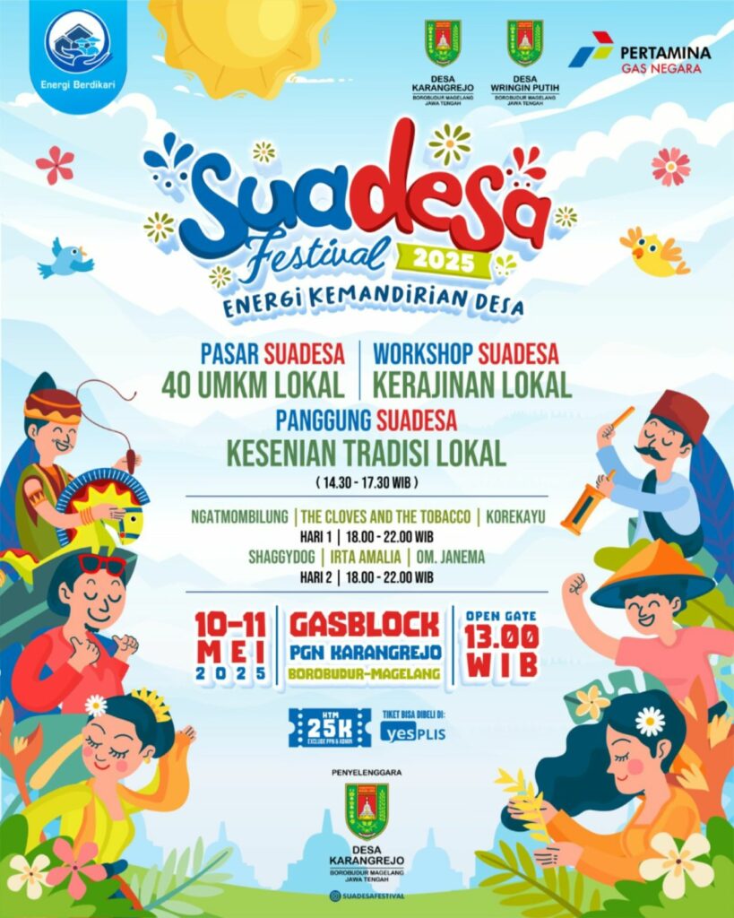 Jakarta, UP Radio – Dalam rangka semarak HUT ke 60 pada 13 Mei 2025, PT Perusahaan Gas Negara Tbk (PGN) menyelenggarakan Suadesa Festival 2025 pada 10 – 11 Mei 2025 di Gasblock PGN Karangrejo, Magelang. Festival ini merupakan perwujudan program Desa Energi Berdikari Pertamina dimana Desa Karangrejo, Borobudur yang merupakaan desa binaan PT PGN Tbk.
