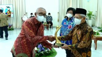 Wakil Presiden Republik Indonesia, Ma’ruf Amin, menyerahkan trofi PROPER Emas kepada Direktur Utama SBI, Lilik Unggul Raharjo, di Istana Wakil Presiden di Jakarta, 29 Desember 2022.