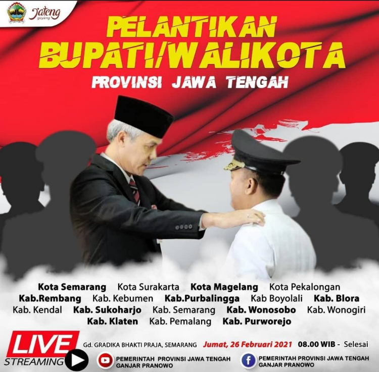 Dari 21 daerah di Provinsi Jawa Tengah, 17 daerah yang mengikuti pelantikan pada besok Jumat (26/2/2021) yakni Kabupaten Boyolali, Kabupaten Kendal, Kabupaten, Blora, Kabupaten Pemalang, Kabupaten Kebumen, Kabupaten Wonosobo, Kabupaten Klaten, Kabupaten Sukoharjo, Kabupaten Purbalingga, Kabupaten Semarang, Kabupaten Wonogiri, Kabupaten Purworejo, Kabupaten Rembang, Kota Pekalongan, Kota Semarang, Kota Magelang, dan Kota Surakarta. Untuk empat daerah lainnya seperti Kabupaten Grobogan, Kabupaten Demak, Kabupaten Sragen, Kabupaten Pekalongan tidak mengikuti pelantikan pada Jumat (26/2/2021) dikarenakan belum selesai masa jabatannya. (hum)