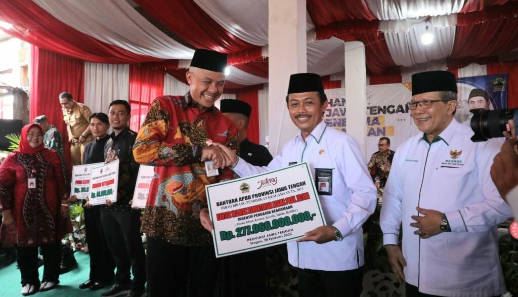 Sragen, UP Radio – Gubernur Jawa Tengah Ganjar Pranowo menyerahkan bantuan hibah bidang keagamaan dan pendidikan keagamaan tahun anggaran 2023, senilai total Rp434 miliar. Bantuan hibah itu rutin diberikan setiap tahun dengan sasaran kelompok guru atau pengajar agama, rumah ibadah, bantuan operasional sekolah, dan lembaga pendidikan agama.