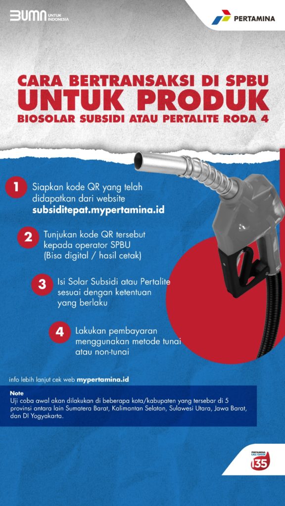 Dalam upaya memastikan penyaluran BBM bersubsidi bisa tepat sasaran dan tepat kuota, Pertamina menerapkan mekanisme baru yakni dengan cara pendaftaran BBM lewat website subsiditepat.mypertamina.id khusus untuk kendaraan roda empat (mobil).