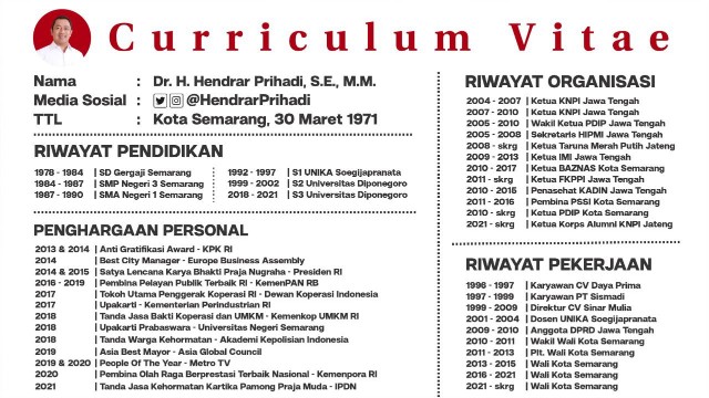 Semarang, UP Radio – Dr Hendrar Prihadi, SE MM merupakan Wali Kota Semarang yang menjabat sejak tahun 2013. Pria yang akrab disapa Hendi ini lahir pada tanggal 30 Maret tahun 1971 di Kota Semarang, sebagai anak ke-10 dari 10 bersaudara dari pasangan Sunarso dan Sunarti.