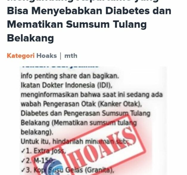 Menurut Kominfo melalui link beritanya https://www.kominfo.go.id/content/detail/18707/hoaks-19-minuman-mengandung-aspartame-yang-bisa-menyebabkan-diabetes-dan-mematikan-sumsum-tulang-belakang/0/laporan_isu_hoaks
