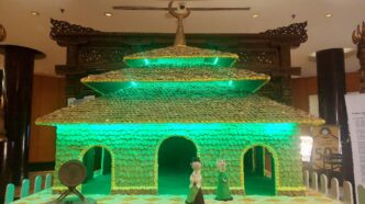 “Replika dibuat dari bahan kepingan kue kering atau dikenal dengan kue kuping gajah dengan hiasan bedug berbahan coklat,” terang Shella.
