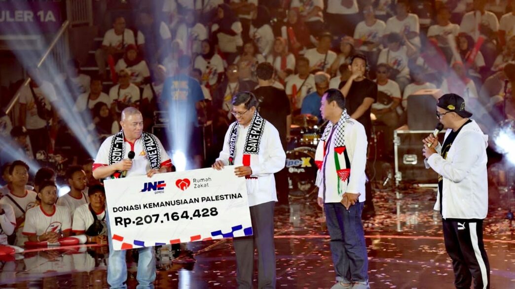Di saat perayaan puncak HUT, sesuai dengan filosofi Berbagi, Memberi, dan Menyantuni seluruh karyawan JNE secara sukarela memberikan bantuan donasi untuk masyarakat Palestina melalui Program Peduli Kemanusiaan Palestina JNE Bersama Rumah Zakat. Donasi diserahkan secara simbolis dari Presiden Direktur JNE, M.Feriadi Soeprapto kepada CEO Rumah Zakat, Irvan Nugraha. Dalam penggalangan dana tersebut berhasil terkumpul dana sebesar Rp 207.164.428 yang akan langsung disalurkan oleh Rumah Zakat untuk masyarakat Palestina didistribusikan bersama dengan bantuan pemerintah Indonesia.
