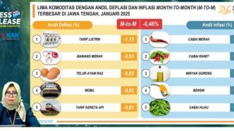 Semarang, UP Radio – Badan Pusat Statistik (BPS) mencatat Jawa Tengah mengalami deflasi (penurunan harga dan jasa) bulan ke bulan atau Month to Month (M-to-M) sebesar -0,46 persen. Kondisi ini, dipengaruhi salah satunya karena diskon tarif listrik 50 persen, yang diterapkan pada awal 2025.