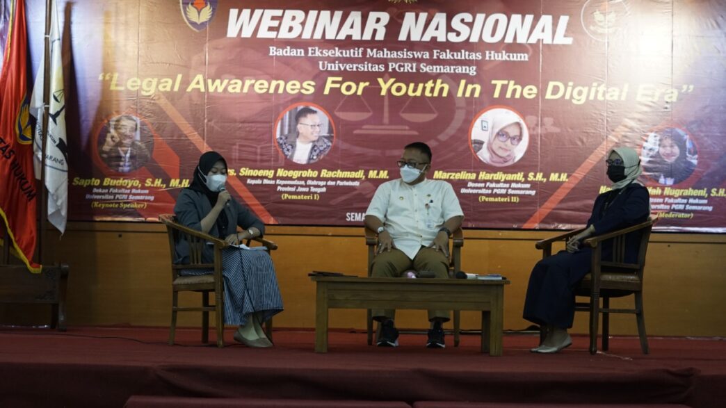 Semarang, UP Radio – Badan Eksekutif Mahasiswa (BEM) Fakultas hukum Universitas PGRI Semarang (FH UPGRIS) menggelar webinar nasional di gedung pusat UPGRIS bertema Legal Awarenes For Youth In The Digital Era, Senin (15/11).