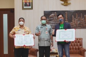 City Manager of Central Java, Grab Indonesia, Ramdan Fitriyadi (kanan) bersama Kepala Dinas Tenaga Kerja Kota Semarang, Dr. Sutrisno, S.KM (kiri) menandatangani piagam kerja sama dalam perluasan peluang pendapatan dan penyelenggaraan pelatihan bagi pelaku UMKM. Penandatanganan ini turut disaksikan oleh Sekretaris Daerah Kota Semarang, Ir. Iswar Aminuddin M.T (tengah)