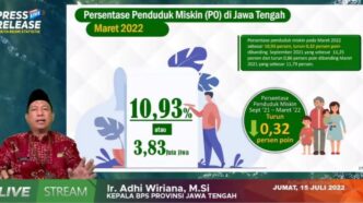 “Alhamdulillah pada Maret 2022 terjadi penurunan kemiskinan dibanding September 2021. Di Jawa Tengah penduduk miskin sebanyak 10,93 persen dari total penduduk atau 3,83 juta orang. Presentase ini terjadi penurunan 0,32 persen poin (dibanding September 2021) dan turun 0,86 persen poin, dibanding Maret 2021 yang sebesar 11,79 persen,” ujarnya, saat rilis daring, Jumat (15/7/2022).