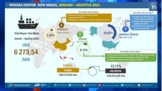 Arjuliwondo menyebut, total ekspor non migas Januari-Agustus 2021 mencapai USD 6.273,54 juta. Ekspor itu dilakukan ke lima negara tujuan yaitu Amerika Serikat, Jepang, Tiongkok, negara-negara Uni Eropa dan Asean.