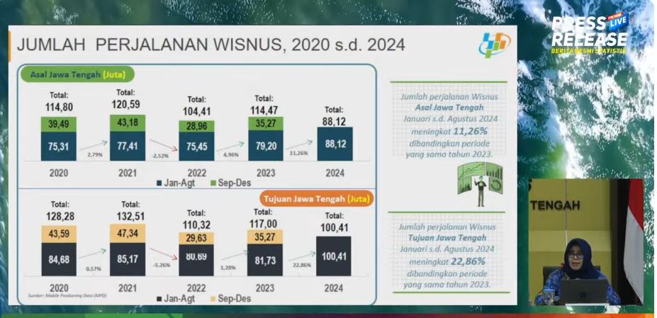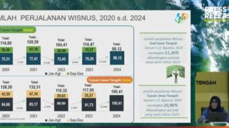 Menurutnya, untuk tujuan ke Jateng, tercatat 10,85 juta perjalanan pada September 2024, atau mengalami kenaikan dibandingkan Agustus 2024. Dijelaskan, wisnus yang dimaksud adalah mereka yang melakukan perjalanan minimal enam jam, dengan perjalanan dilakukan di luar perjalanan biasanya, seperti perjalanan kerja dan perjalanan ke luar rumah.