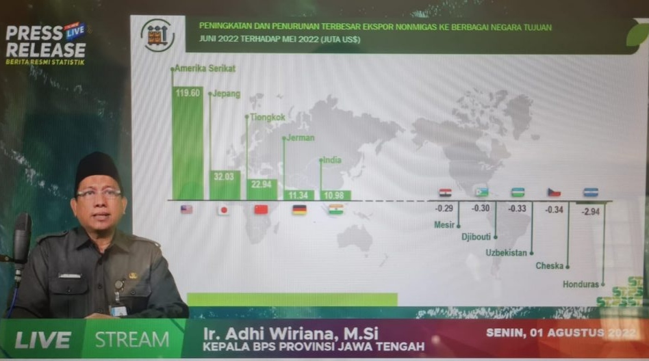“Peningkatan terbesar ekspor nonmigas terjadi pada beberapa golongan barang. Di antaranya pakaian (bukan rajutan) 67,72 juta dolar AS, kayu dan barang dari kayu 40,43 juta dolar AS, pakaian (rajutan) 35,03 juta dolar AS, alas kaki 34,11 juta dolar AS, seta perabotan, lampu dan alat penerang mencapai 33,69 juta dolar AS,” kata Adhi saat rilis berita BPS di Semarang (1/8/2022).