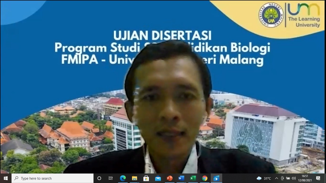 Prasetiyo berhasil mempertahankan Disertasi dengan judul pengembangan model Pembelajaran Berbasis Isu Berkelanjutan (PBIB) dan pengaruhnya terhadap literasi lingkungan siswa pada ujian terbuka program doktor pendidikan biologi Kamis (12/8/2021).