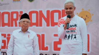 Semarang, UP Radio – Gubernur Jawa Tengah Ganjar Pranowo mendampingi Wakil Presiden Ma’ruf Amin pada acara puncak peringatan Hari Anak Nasional (HAN) ke-39 tahun 2023 di Lapangan Pancasila Simpanglima, Kota Semarang, Minggu (23/7/2023) sore. Sedikitnya 750 anak-anak dari berbagai penjuru Indonesia berpartisipasi dalam acara tersebut.