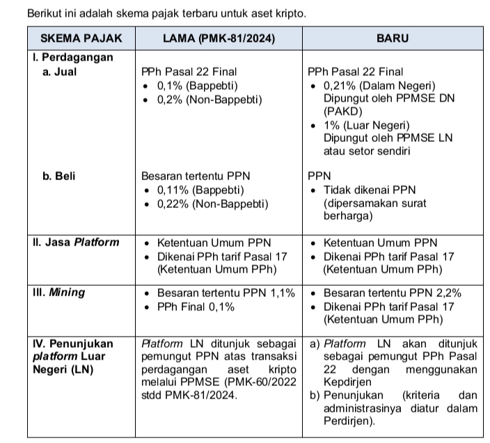 Dari sisi perpajakan, penyerahan aset kripto yang kini dipersamakan dengan surat berharga tidak lagi dikenakan PPN. Meskipun demikian, penghasilan yang diperoleh dari transaksi aset kripto tetap dikenai PPh Final Pasal 22.