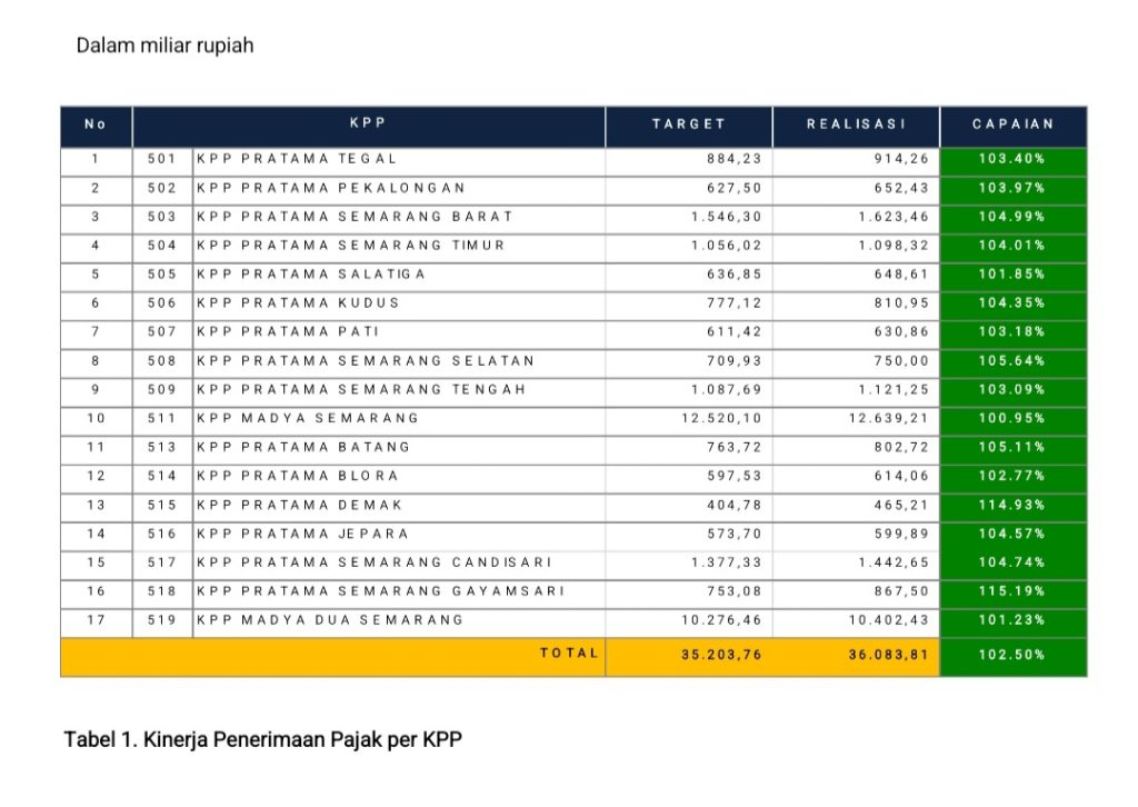 Pencapaian ini tentu tidak lepas dari kinerja 17 (tujuh belas) unit kerja KPP di wilayah Jawa Tengah I, yaitu 2 (dua) KPP Madya dan 15 (lima belas) KPP Pratama yang kesemuanya berhasil melampaui target penerimaan di atas 100%.