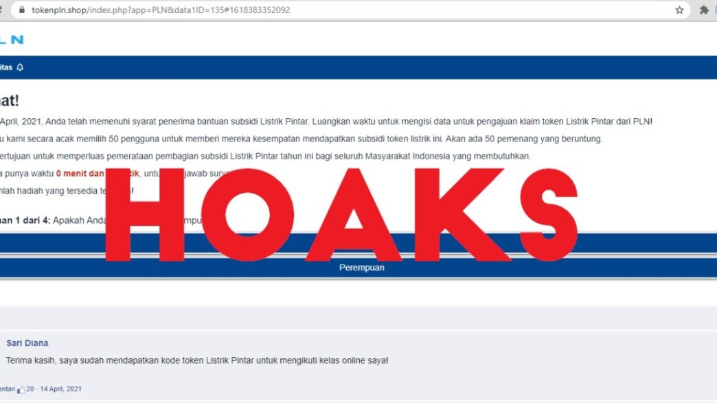 Jakarta, UP Radio – PLN memastikan pendaftaran subsidi listrik bagi pelanggan rumah tangga daya 450 Volt Ampere (VA) dan 900 VA melalui situs web https://tokenpln.shop/index.php?app=PLN&data1ID=135 hoaks. PLN mengimbau pelanggan untuk berhati-hati terhadap informasi terkait cara memperoleh stimulus listrik dan juga subsidi listrik.