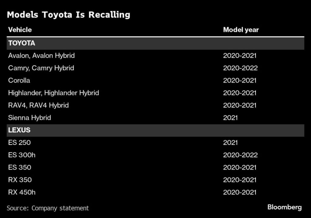 Penarikan kembali ini berdampak pada sejumlah model tahun 2020-2022 berbahan bakar gas dan hybrid, termasuk Toyota Avalon, Camry, Corolla, Highlander, RAV4, dan Sienna, serta model-model Lexus ES dan RX. (tyt)