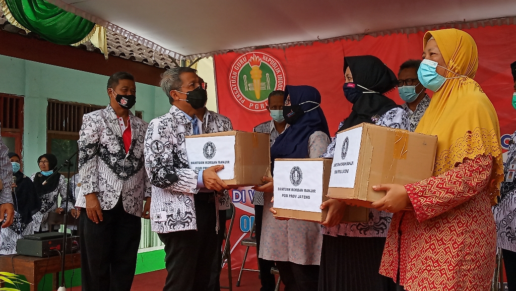“Kepada seluruh warga masyarakat yang terkena musibah banjir, longsor yang terjadi akhir akhir ini diantaranya juga menimpa para tenaga pendidik, untuk itu PGRI ingin menyampaikan rasa keprihatinan dengan membantu meringankan beban mereka,” kata Ketua Pengurus PGRI Jawa Tengah Dr Muhdi saat menyerahkan bantuan kepada tenaga Pendidik terdampak banjir di Bangetayu Semarang (16/2/2021).