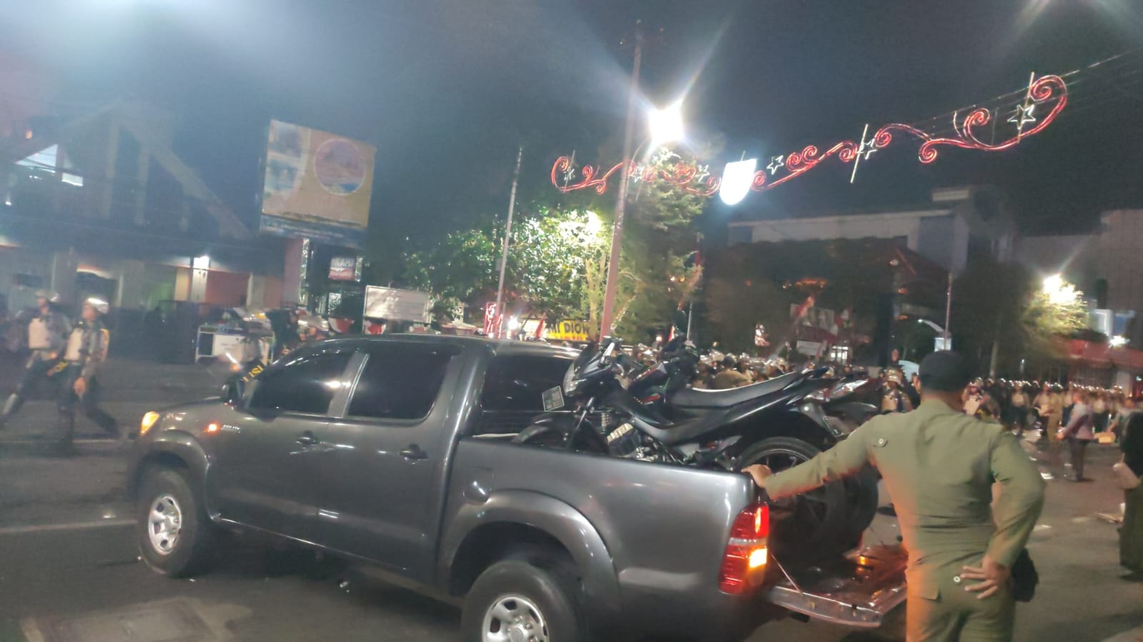 Dari pantauan di lapangan, tampak petugas Satuan Polisi Pamong Praja (Satpol PP) Kota Semarang mengangkut kendaraan milik demontran yang tertinggal.