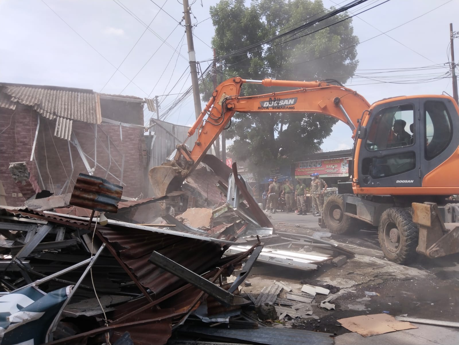 Petugas pun mengeluarkan barang barang dari dalam bangunan. Selanjutnya petugas merobohkan bangunan menggunakan alat berat begu.