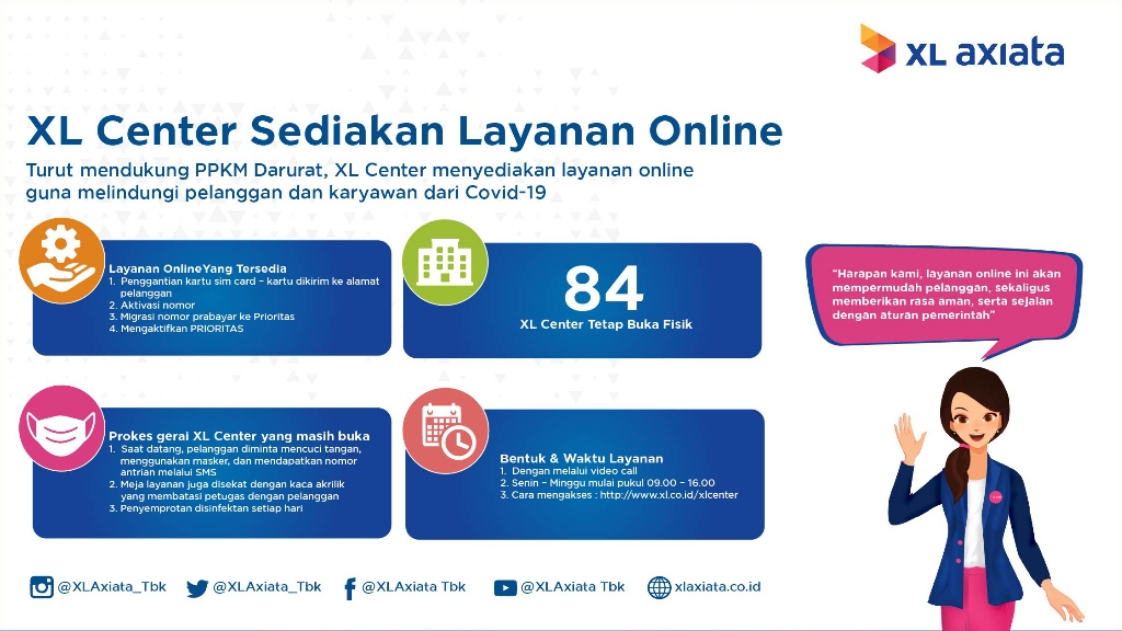 “Meskipun ada layanan online, sebagai salah satu sektor esensial maka selama masa PPKM Darurat ini, terdapat beberapa gerai XL Center yang juga masih tetap dibuka dengan menerapkan protokol kesehatan ketat dan jumlah petugas terbatas,” tambahnya.