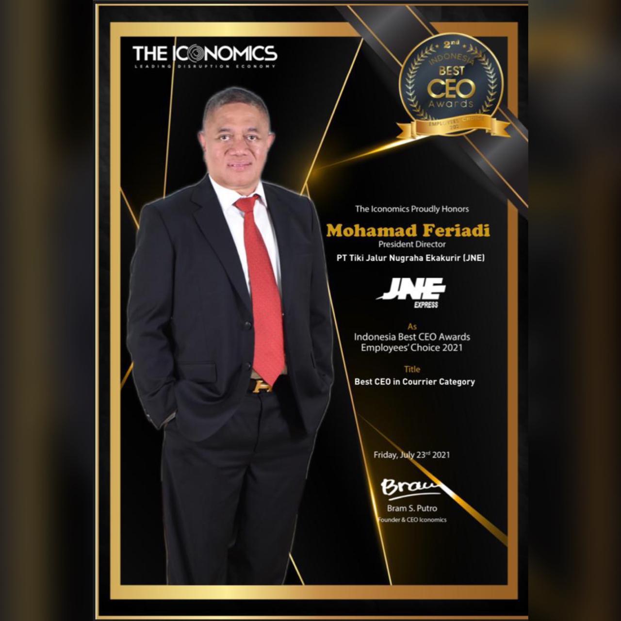 Komitmen untuk selalu mengedepankan kualitas pelayanan kepada pelanggan yang selalu disampaikan Presiden Direktur JNE M. Feriadi Soeprapto kepada seluruh karyawan telah berbuah manis mendapatkan penghargaan bergengsi dari The Iconomics, Indonesia Best CEO Awards “Employee’s Choice kategori In Courier yang diselenggarakan melalui live streaming secara virtual zoom.