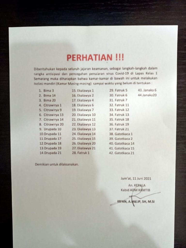 Sebelumnya, beredar surat pemberitahuan kepada petugas keamanan dan para narapidana penghuni 44 kamar Lapas Kedungpane untuk melakukan isolasi mandiri sebagai langkah-langkah dalam rangka antisipasi dan pencegahan penularan Covid-19 di Lapas Kelas I Semarang.