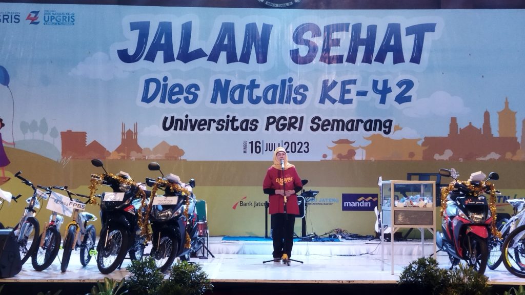 “Acara Jalan Sehat ini tidak hanya menjadi momen berolahraga, melainkan juga momen kebersamaan bagi keluarga besar UPGRIS saja tetapi juga warga yang tinggal dusekitar kampus,” Kata Rektor UPGRIS, Dr Sri Suciati MHum dalam sambutanya di acara jalan sehat.