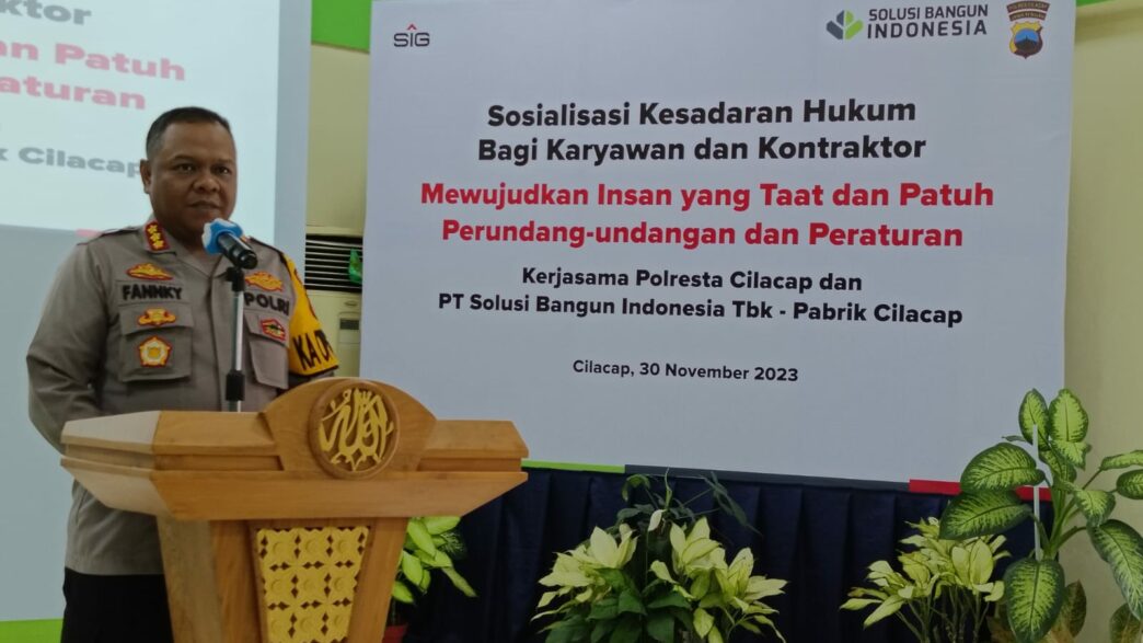 Cilacap, UP Radio – Kepala Kepolisian Resor Kota Cilacap, Kombes Pol Fannky Ani Sugiharto SIK MSi bersama General Manager PT Solusi Bangun Indonesia Tbk (SBI) Pabrik Cilacap, Edi Sarwono membuka Sosialisasi Kesadaran Hukum untuk karyawan dan kontraktor di lingkungan SBI, Kamis 30 November 2023.