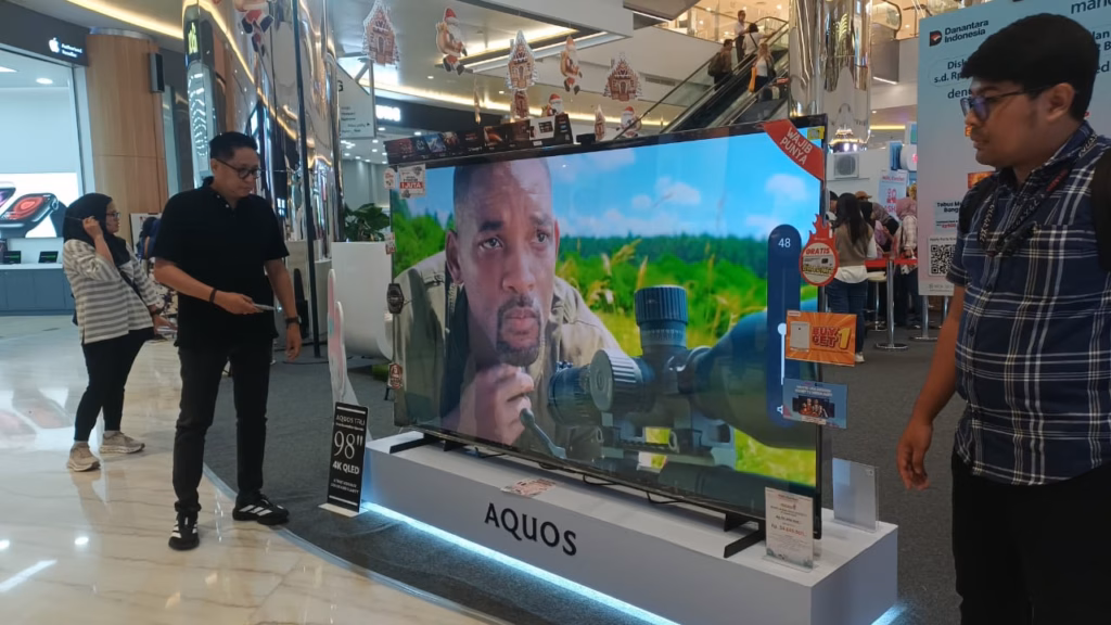 Sorotan pameran tertuju pada kehadiran Sharp LED TV 98 inci, produk terbesar Sharp yang menawarkan pengalaman hiburan sinematik di rumah. TV ini dilengkapi resolusi 4K Ultra HD, refresh rate 144 Hz, teknologi QLED dengan 1 miliar warna, serta sistem audio Dolby Atmos, didukung Android TV dan Google Assistant.