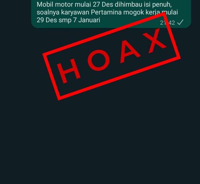 Terkait pesan yang menyebar luas di masyarakat tentang himbauan isi penuh tanki bensin mulai 29 Desember 2021 s/d 7 Januari 2022, Pertamina tegaskan bahwa informasi tersebut adalah hoax, tidak benar dan menyesatkan.
