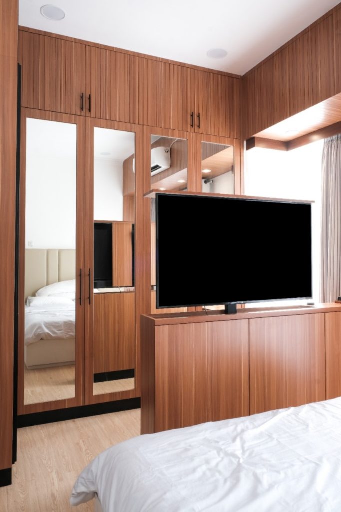 Ririe memanfaatkan area bawah tangga untuk dijadikan rak sepatu, menggunakan murphy bed atau ranjang yang bisa dilipat ke dinding, serta membuat TV lift cabinet agar dapat menyimpan TV ketika sedang tidak sedang digunakan. “Pemilihan lantai juga memiliki peran penting dalam mendekorasi rumah. Sehingga saya memilih lantai Vinyl untuk dapat menciptakan ruangan yang hangat, nyaman dan tampak lebih luas. Serta pemasangannya mudah, tahan akan air, anti rayap dan mudah dibersihkan.