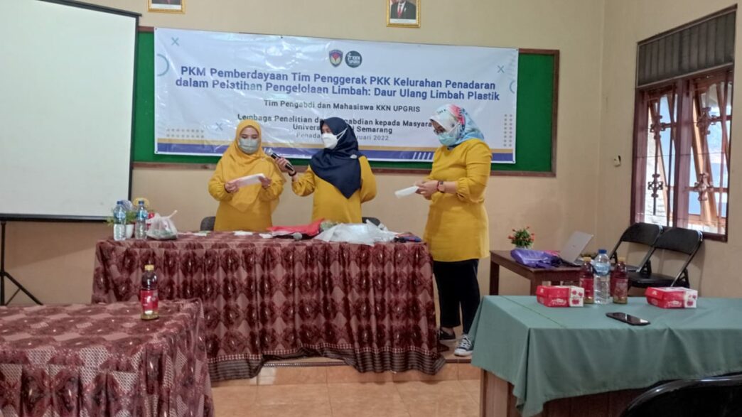 Sejalan dengan upaya pemerintah pusat maupun daerah, Tim pengabdi dan Mahasiswa KKN Universitas PGRI Semarang (UPGRIS) mengadakan pelatihan pengelolaan limbah plastik (Daur ulang limbah plastik) di Desa Penadaran, Kec.Gubug, Kab.Grobogan (24/2).