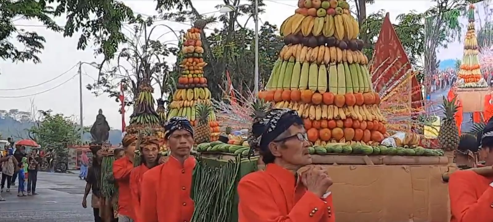 Warga menggelar tradisi sesaji rewanda ini berjalan mulai dari Masjid Al Mabrur Talun Kacang menuju Goa Kreo Semarang membawa berbagai macam hasil bumi yang dibentuk gunungan.