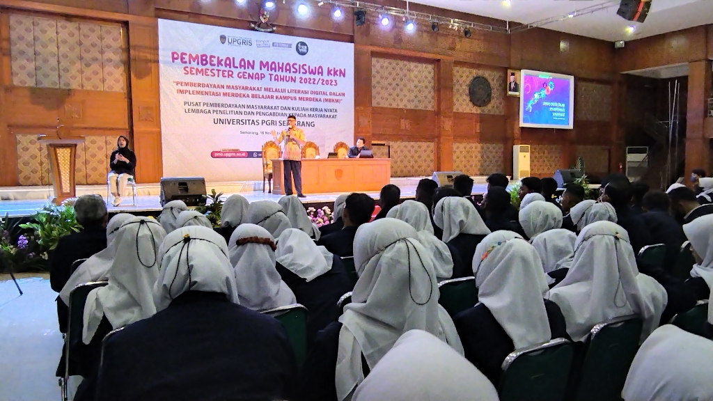 Semarang, UP Radio – 1.725 mahasiswa Universitas PGRI Semarang (UPGRIS) mengikuti pembekalan sebelum berangkat melaksanakan Kuliah Kerja Nyata (KKN) Semester Genap Tahun 2022/2023 di Balairung Kampus UPGRIS Semarang, (16/11/2022).